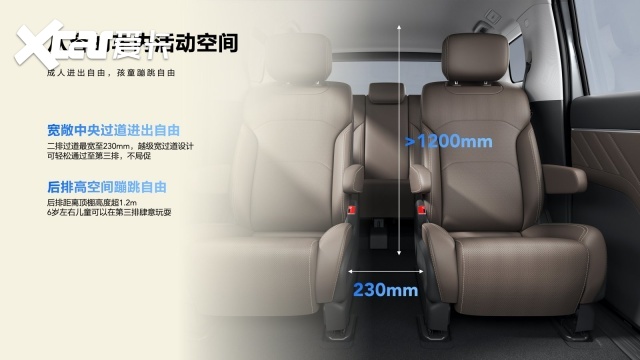 第二排是两个独立座椅,有腿托,二排过道的宽度达到了230mm,行业内一般达到180mm已经算得上优秀水平了,星光730进出第三排会更轻松。