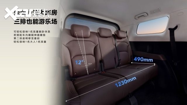 第三排座椅决定了一台MPV舒适性的下限,星光730的第三排还是很有亮点的,首先座椅宽度达到490mm,儿童躺卧或三个成年人并排坐,都不会有拥挤感,同时第三排的靠背角度也很大,能做到接近躺平的姿势。值得一提的是,第三排地板至顶棚超1.2米,孩子在车内可以自由行走。