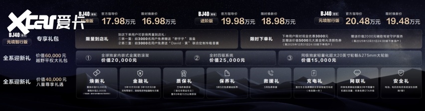自此,BJ40增程家族一共拥有标准版、进阶版、元境智行版三个版型。北京越野还带来了BJ40增程三个版型均能享受的两大全系迎新礼。