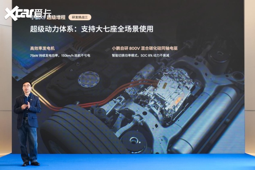 其三,是增程的保电能力与动力体验一致性挑战,确保小鹏X9超级增程能够拥有同级领先的发电能力、保电能力、馈电动力。华为DriveONE全栈高集成高压油冷发电机能提供75kW持续发电功率,成为系统的“强力心脏”,配合小鹏自研的综合效率高达93.5%的800V混合碳化硅同轴电驱,可实现150km/h巡航不亏电。不仅如此,还拥有同级最强亏电动力,8% SOC动力不衰减。面对高速、加速、爬坡等场景告别动力不足、耗电快和亏电焦虑。