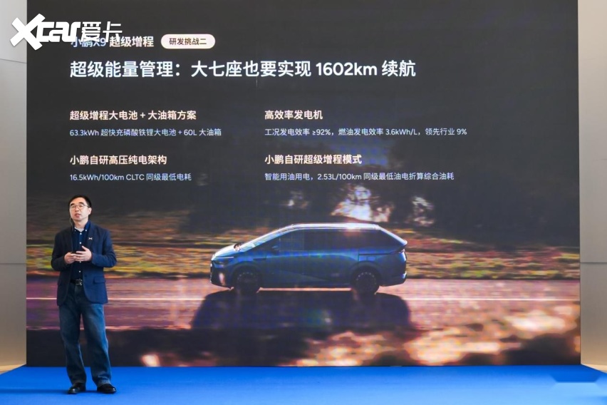 其二,是挑战更高效率,作为定义下一代增程发电机的技术,如何能够实现支撑1602km全球大七座最长续航?依托小鹏X9超级增程优秀的平台架构和能量管理体系,华为DriveONE全栈高集成高压油冷发电机实现了工况发电效率≥92%、燃油发电效率达3.6kWh/L的行业领先水平,配合小鹏自研的高压纯电架构16.5kWh/100km的超低电耗与小鹏自研超级增程模式的2.53L/100km 同级最低油电折算综合油耗,令小鹏X9超级增程以1602km的综合续航实力,成为了大七座车型中综合续航里程全球最长、亏电油耗最低的优秀表现。