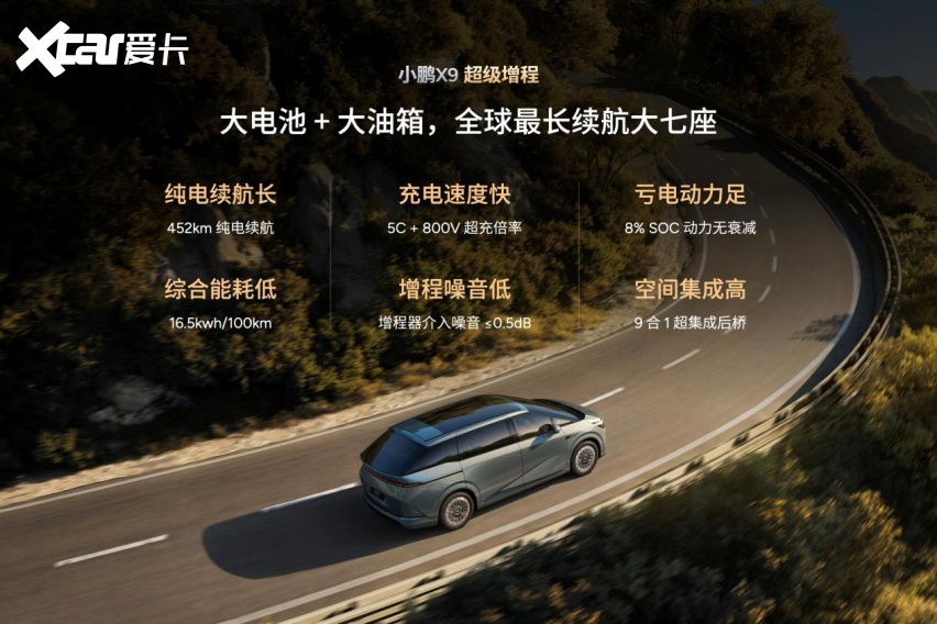 作为鲲鹏超级增程技术的颠覆之作,小鹏X9超级增程以“超快充大电池+大油箱”组合,重新定义「下一代增程」。同时,作为一款面向全球家庭用户的增程AI大七座,小鹏X9超级增程对其动力系统提出极高标准,分别为“纯电续航长、充电速度快、亏电动力足、综合能耗低、增程噪音低、空间集成高”,这要求在架构设计上实现一车双能且不侵占车内乘坐空间;续航上能够兼容5C超快充高压大电池+大油箱;动力上实现同级领先的大七座发电与保电能力;在传统增程最关键的静谧槽点上要求降噪NVH≤0.5dB(A),真正做到完美融合纯电体验的优势与无感增程的从容,为全球用户打造“下一代增程”体验。