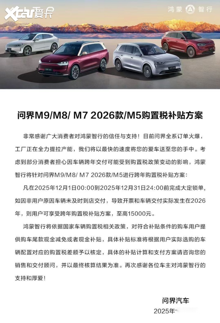 对于计划年底购车的消费者而言,当前正是抢占政策红利的最后窗口期,既能享受2025年购置税全额免征的优惠,又能获得问界跨年补贴的稳稳保障,叠加问界M9等旗舰车型的实力加持,无疑是入手高端智能汽车的绝佳时机。
