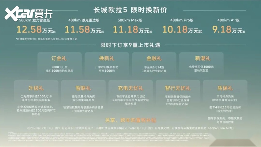 即日起至2025年12月31日,用户下订并锁单即可尊享包含订金礼、换新礼、智行无忧礼在内的9重上市好礼,以及跨年购置税补贴(不含480km Air版)等购车权益。