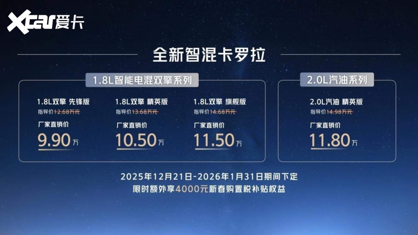 12月21日,“全球好品质 中国新家轿”全新智混卡罗拉焕新上市,共推出4个版本,厂商直销价为:9.9万元-11.8万元。即日起至1月31日期间下定,限时额外享受4000元新春购置税补贴权益。