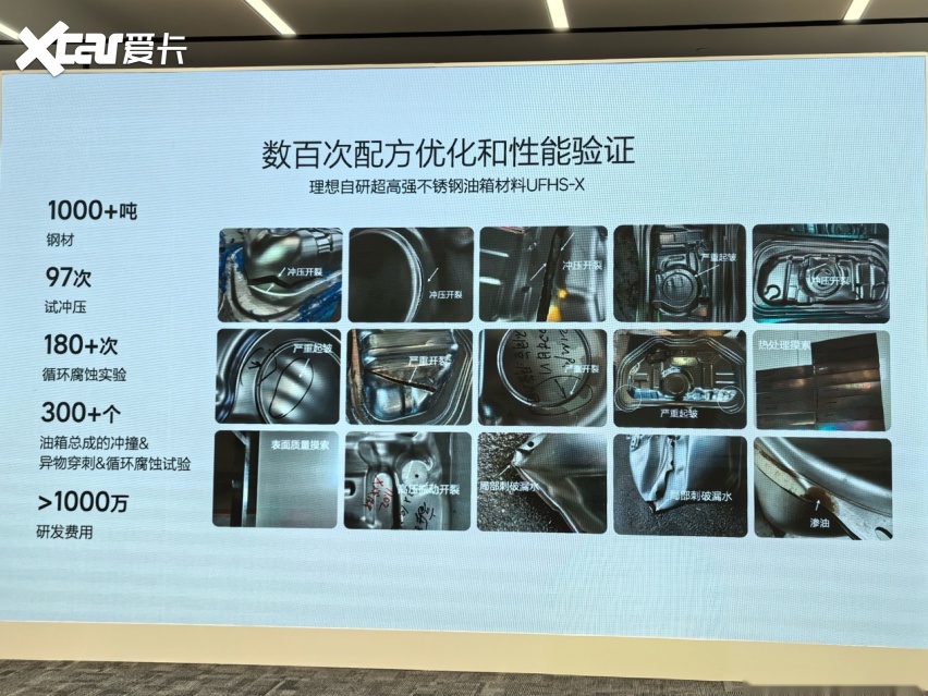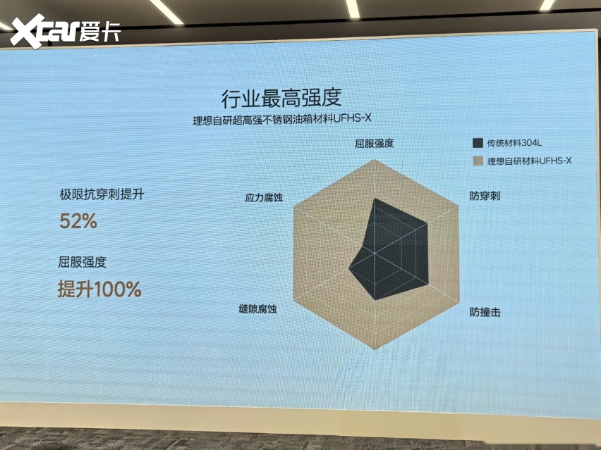 说到最后的研,当前两者都无法满足的时候,理想自己的研发团队就会自研材料,以油箱为例混动汽车的油箱主要是高压油箱,采用高性能不锈钢替代传统树脂材料制造油箱。但即使是采用了高强度的304不锈钢材料,在复杂路况下,油箱也会有被异物穿刺的风险,当理想提出研发强度更高的产品时,得到的是多家材料企业的拒绝,理想就通过自研的形式开发出了超高强不锈钢油箱材料UFHS-X,它相比于传统304L屈服强度提升了100%,抗穿刺能力提升了52%,在极限的碰撞和托底场景中,具备更强的防护能力。