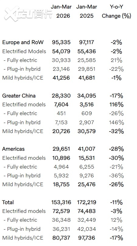 从区域市场表现来看,各主要市场均出现不同程度下滑。其中,美洲市场降幅最为明显,一季度销量29,651辆,同比大幅下降28%,主要受美国关税政策调整、消费者信心不足及电动车型补贴退坡等因素影响。大中华区市场销量28,330辆,同比下降17%,超过全球平均降幅,主要受市场竞争加剧、春节假期延长及季节性因素影响。