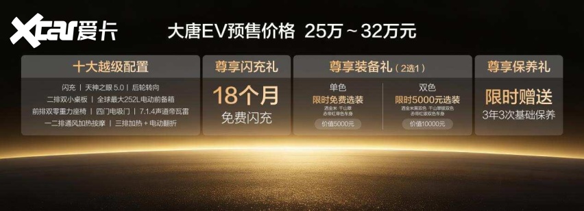 此次大唐EV共推出800KM后驱、950KM后驱、850KM四驱三种续航,预售价25万元~32万元。预售期间下订,可享18个月免费闪充权益、三款单色车漆0元选装、双拼色限时半价5000元及3年3次免费保养等多重尊享礼遇。