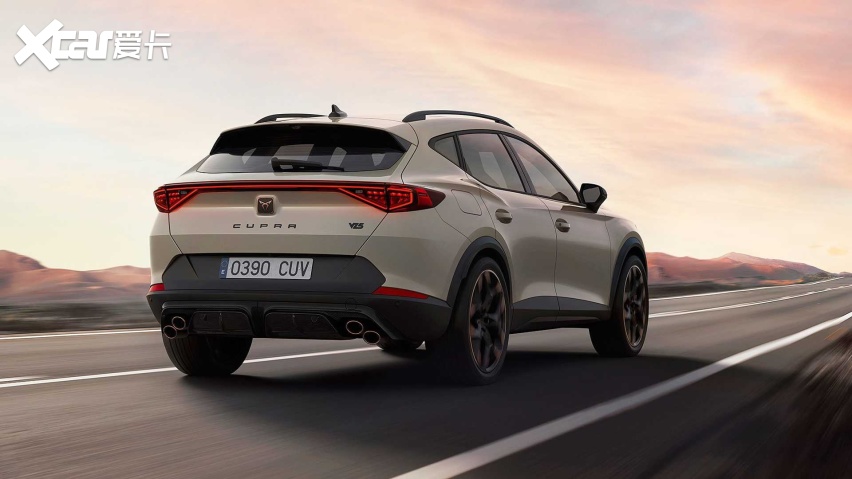 外观方面,性能更强的Cupra Formentor VZ5拥有更加激进的外观设计。此外相比普通的Formentor车型,Formentor VZ5车身降低了0.4英寸,而18英寸的制动盘,六活塞的Akebono卡钳也让这台车与众不同。类似雷克萨斯F车型的堆叠式四出排气嘴是VZ5独有的,中间的扩散器也更具攻击性。