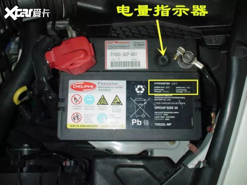 5、打开引擎盖,查看电瓶上的指示器。现在汽车电瓶都是免维护的,在上面有一个电量指示器,当电量指示器显示绿色时,表示电瓶电量充足,电瓶是完好的;当电量指示器显示黑色时,表示电瓶电量不足需要充电了;当电量指示器显示无色或浅黄色时,表示电瓶电量基本用完了。